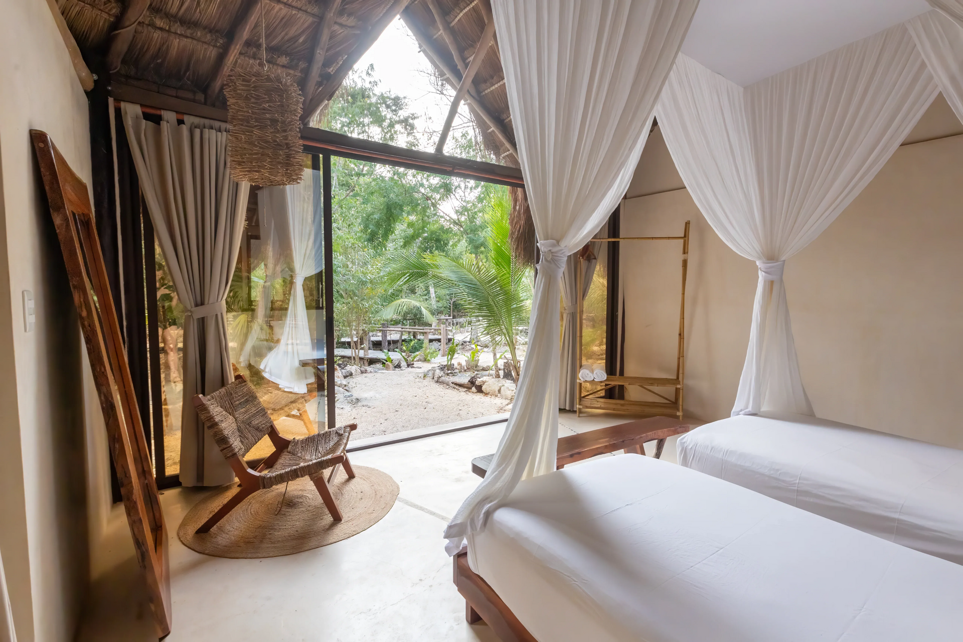 Te hospedarás en amplias eco-cabañas chic, diseñadas para integrarse de forma armónica con la selva, donde el confort, la estética y la calma se unirán para brindarte un descanso profundo después de cada jornada de práctica y exploración.